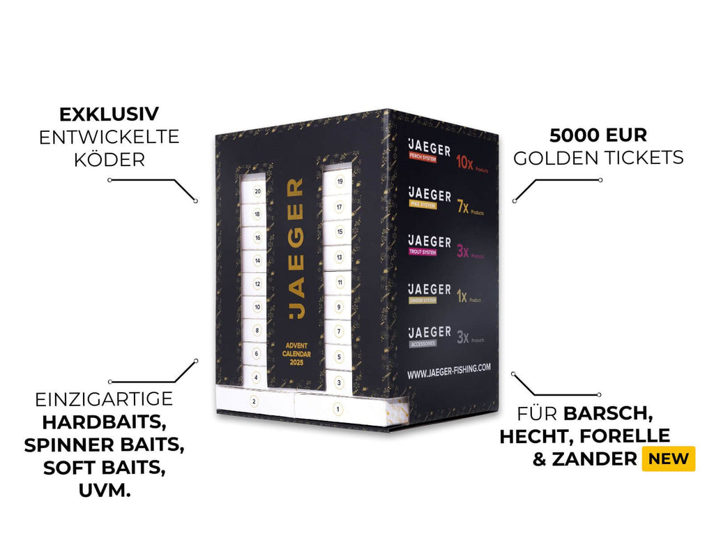 Der JAEGER Adventskalender 2025 ist der ultimative Countdown bis Weihnachten. Mit einem Fokus auf die vier beliebtesten Zielfische – Barsch, Hecht, Forelle & Zander – steckt dieser Kalender voller exklusiver Highlights.