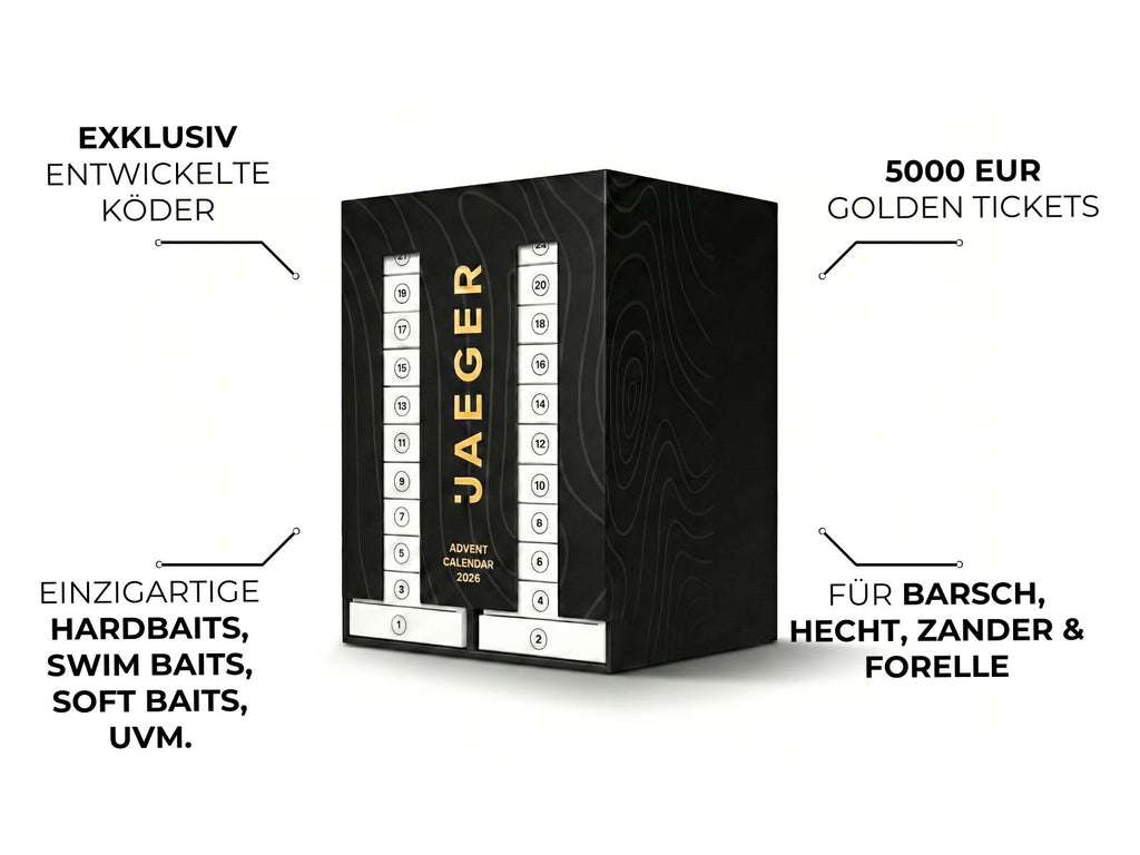 Hinter manchen Türchen steckt nicht nur Angel-Action – sondern echtes Glück. Golden Tickets bringen dir exklusive Extras im Gesamtwert von über 5000 EUR. Von JAEGER Shop-Gutscheinen bis hin zu kompletten Zielfischboxen – Perch Go Kit, Trout Go Kit oder Pike Go Kit. Jeden Tag eine neue Chance. Für goldene Momente.