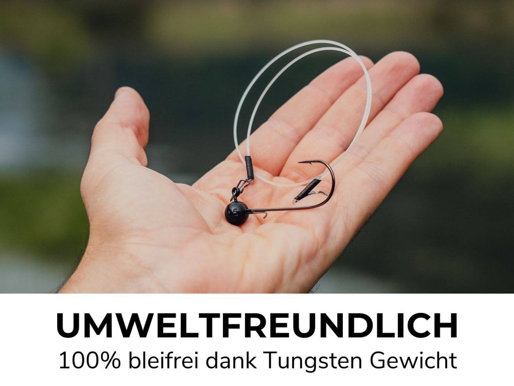 Produkt sicher entsorgen: Entsorgen Sie defekte Haken oder Montagen in einem sicheren Behälter, um Verletzungsgefahren zu vermeiden. Das Tungsten-Gewicht ist umweltfreundlich, dennoch nicht in Gewässern oder der Natur entsorgen. Verpackung bitte gemäß lokalen Recycling-Vorschriften entsorgen.